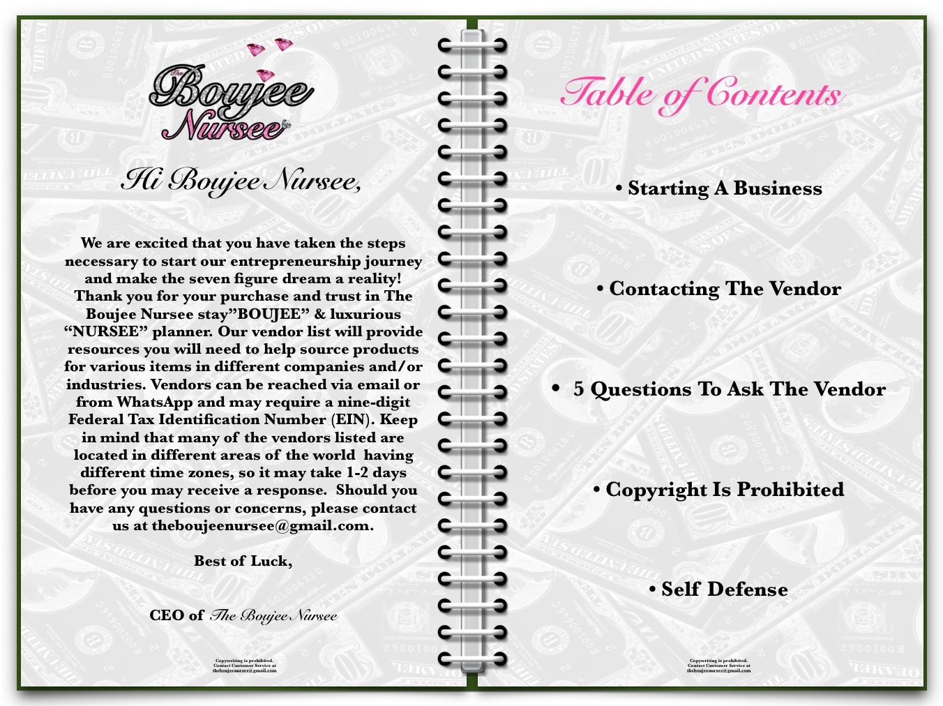 Hi Boujee Nursee! Are you ready to start that self defense business you always dreamed of? Now, you can with using our 10+ safe defense vendor lists. We have done all the work for you compiled from our most trusted, highest quality guaranteed vendors. Plus, BONUS business tools on how to get your business started, how to communicate with vendors, and what to say! These vendors specialize in all types of items, ranging from stun guns, tasers, kubotans, pepper spray, panic alarm, mace, knuckles, customization and more!